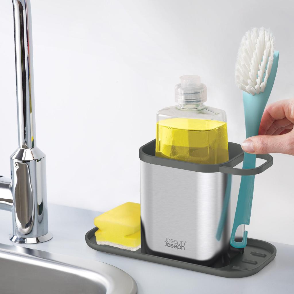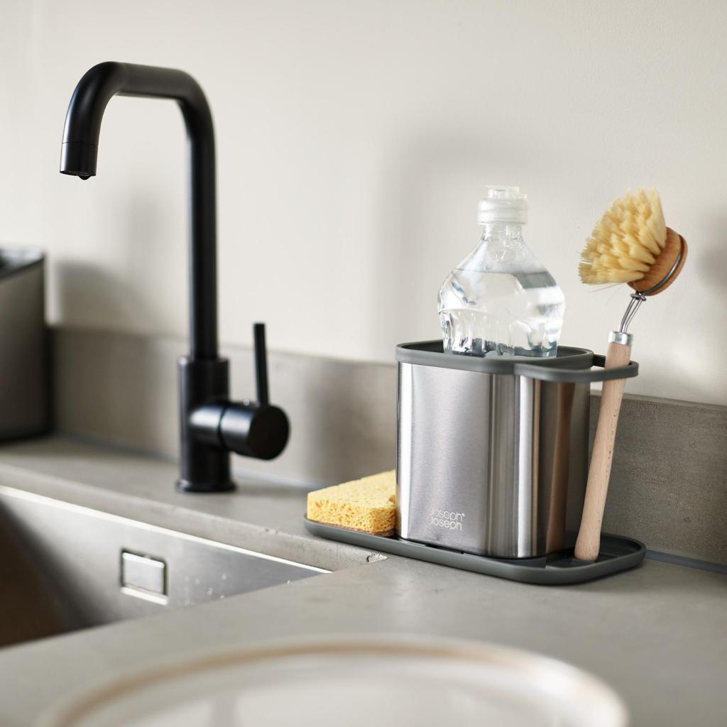 Wanneer na het diner het afwasgoed zich opstapelt, is het laatste waar je je zorgen over wilt maken een wegglijdende spons en omvallende afwasmiddel. Hier heeft alles zijn eigen plek, staat het stabiel en oogt het bijna professioneel. Bijna alsof je een plan had.