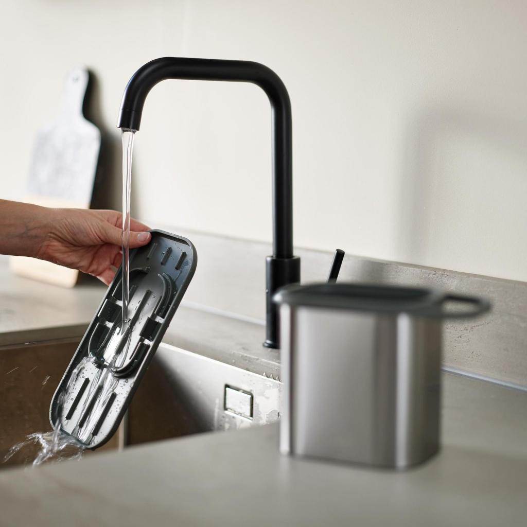 - Compacte afmetingen maken plaatsing zelfs op kleinere werkbladen mogelijk, zonder de ruimte rond de gootsteen te beperken.