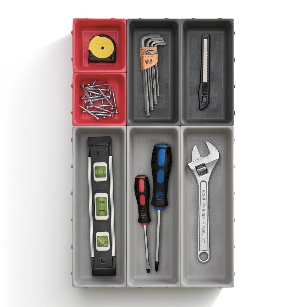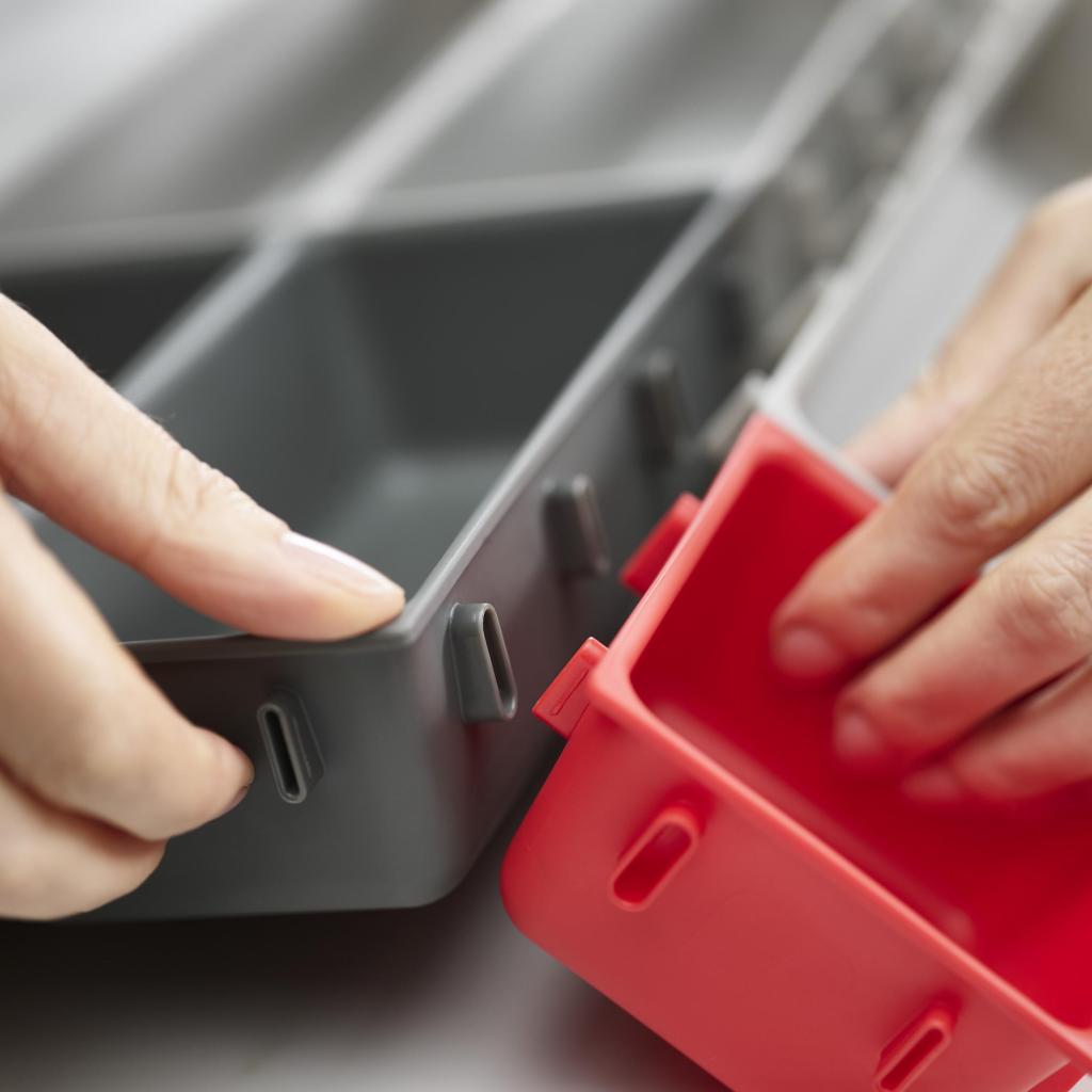 - Dankzij de praktische clips aan alle zijden kunnen de individuele bakjes eenvoudig worden verbonden om een stabiele en overzichtelijke indeling op maat te creëren.