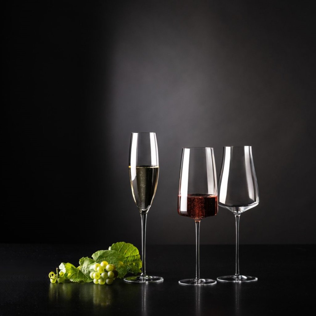 - dankzij het hoge silhouet en het punt waarop de bubbels vrijkomen, laat het glas de fijne bubbels van de wijn mooi uitkomen