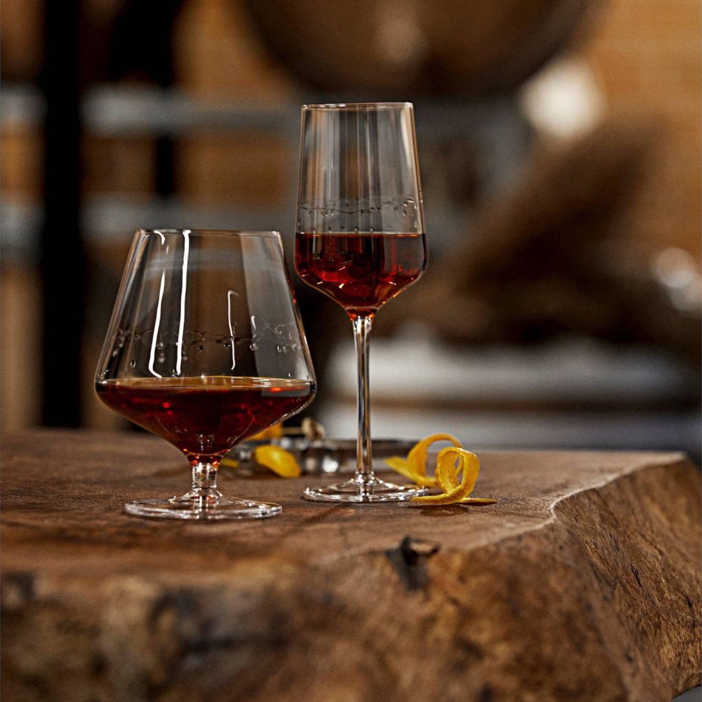 - de vorm van het glas bevordert een zachte opwarming van de drank in de handpalm, waardoor alle geur- en smaakcomponenten vrijkomen