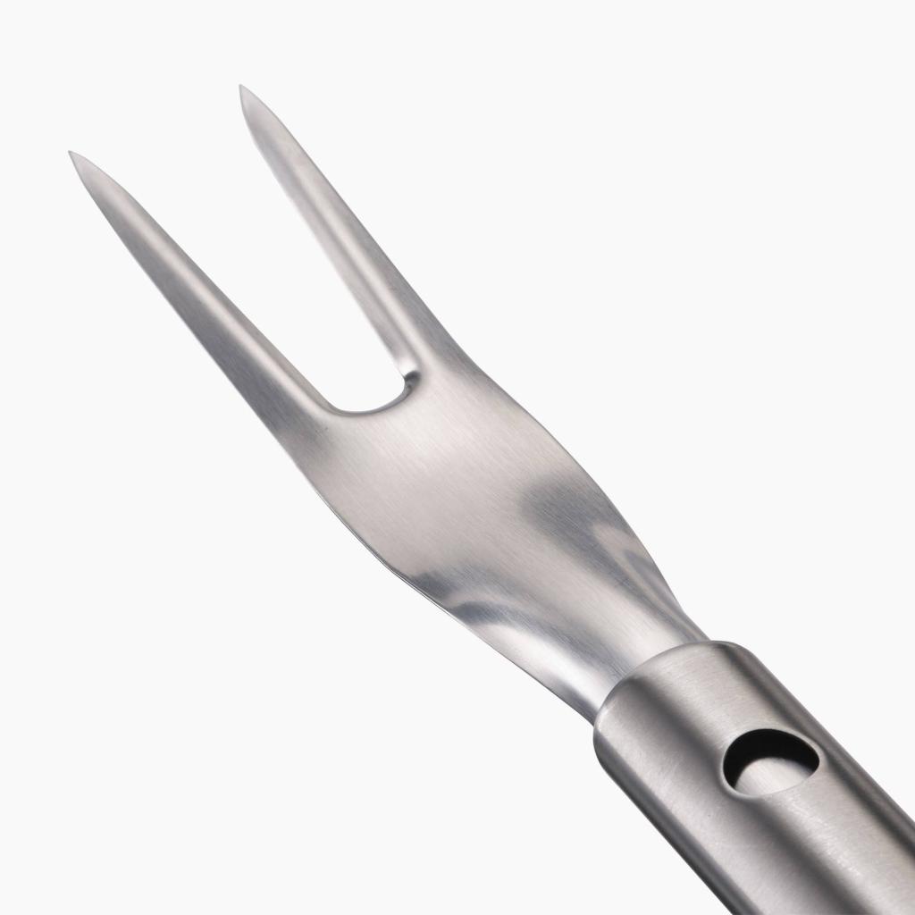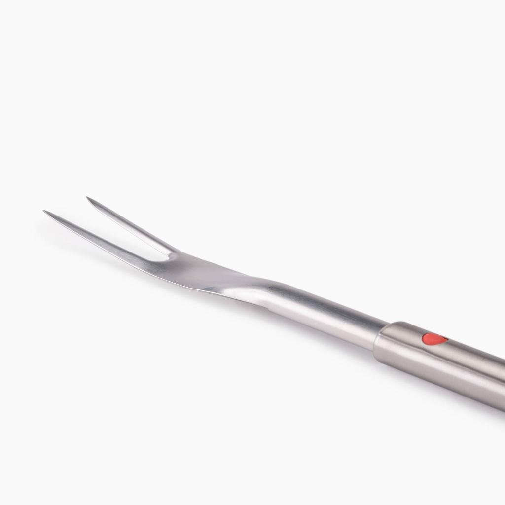 - De vork is geschikt voor het omdraaien van steaks, gebraden ribben of hele stukken vlees waarbij een stevige en zekere grip nodig is.