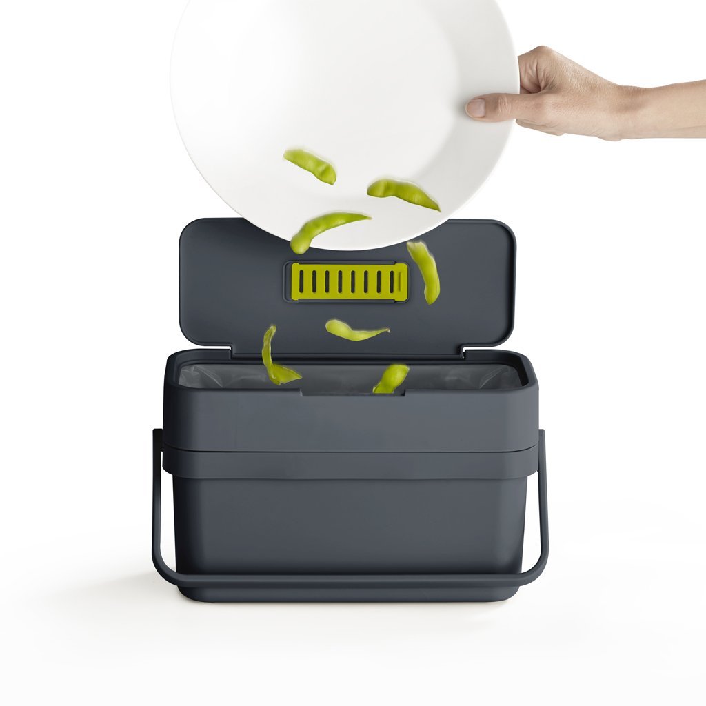 De JOSEPH JOSEPH Compo container is ontworpen als een praktische mand voor restjes. Dankzij zijn smalle vorm neemt hij geen ruimte in op het werkblad. Het wordt geleverd met beugels voor installatie aan de binnenkant van de deur. Het deksel van de container kan wijd worden geopend, zodat restjes gemakkelijk van de borden direct in de container kunnen worden geschept. Het deksel heeft afsluitbare ventilatiegaten. In de open stand laten ze vocht ontsnappen en verminderen ze zo eventuele geurtjes. In de zomer voorkomt de ontluchtingsdop dat insecten de container binnendringen. De inhoud van de container is 4 liter. Bij compostering is het raadzaam biologisch afbreekbare zakken te gebruiken.