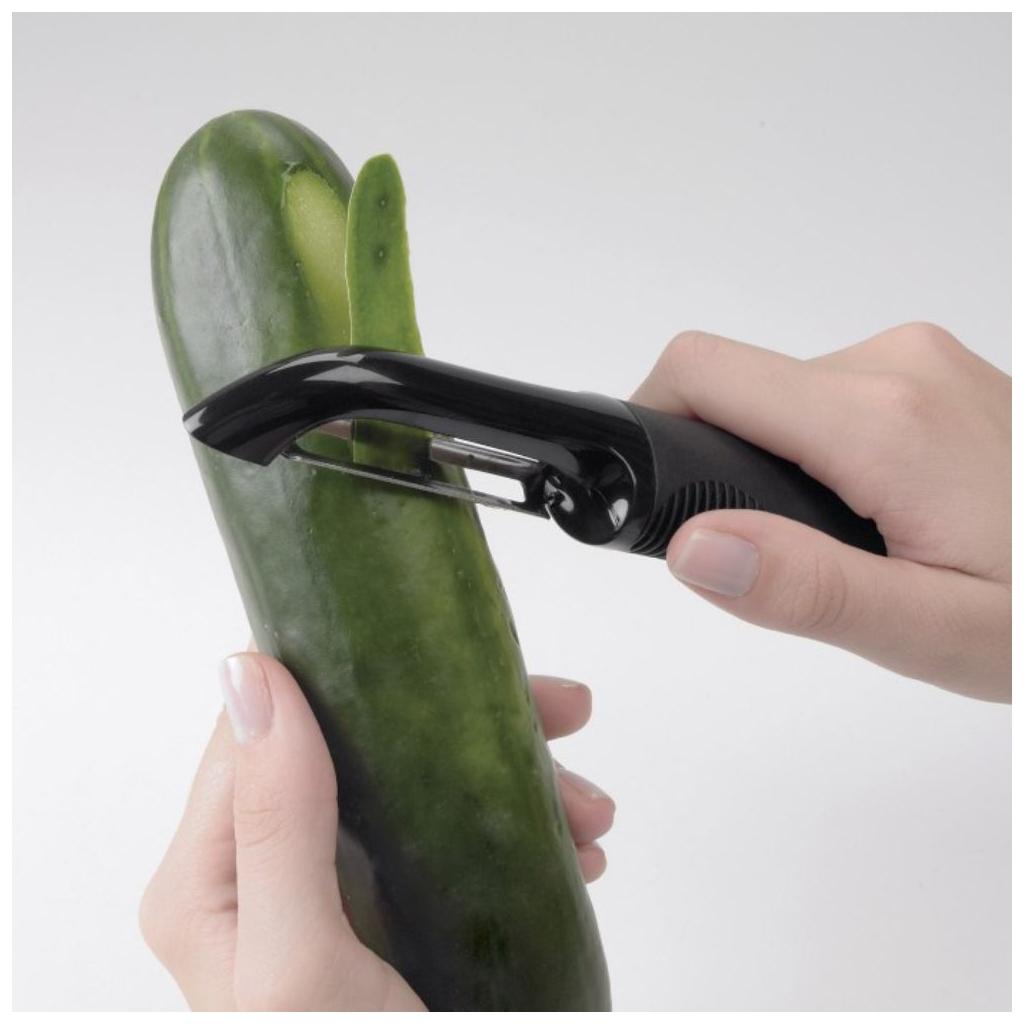 - het scherpe scharnierende lemmet van gehard roestvrij staal past zich aan de vorm van de geschilde groenten aan
