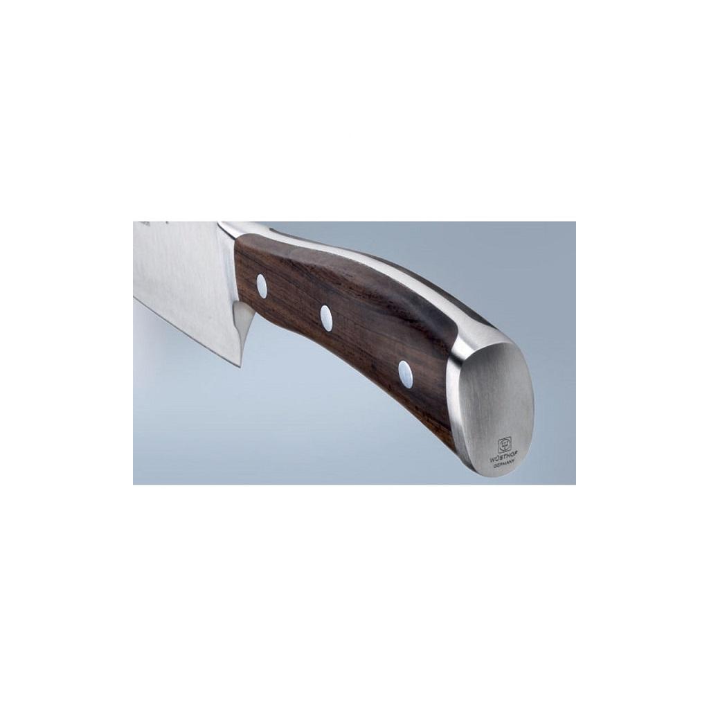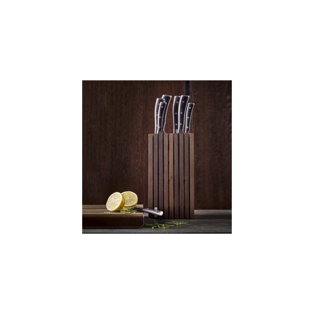 Het ergonomische handvat is gemaakt van Afrikaans grenadillushout. Het is een zeer duurzaam, hard hout met een hogere dichtheid dan ebbenhout. Door het hoge harsgehalte is het relatief ongevoelig voor vocht, maar niet geschikt om in de vaatwasser te wassen. De houten bladen van de Ikon messen zijn stevig aan de schacht bevestigd met drie klinknagels. De perfecte hechting van de afzonderlijke onderdelen voorkomt het insluiten van aanslag en bacteriën.