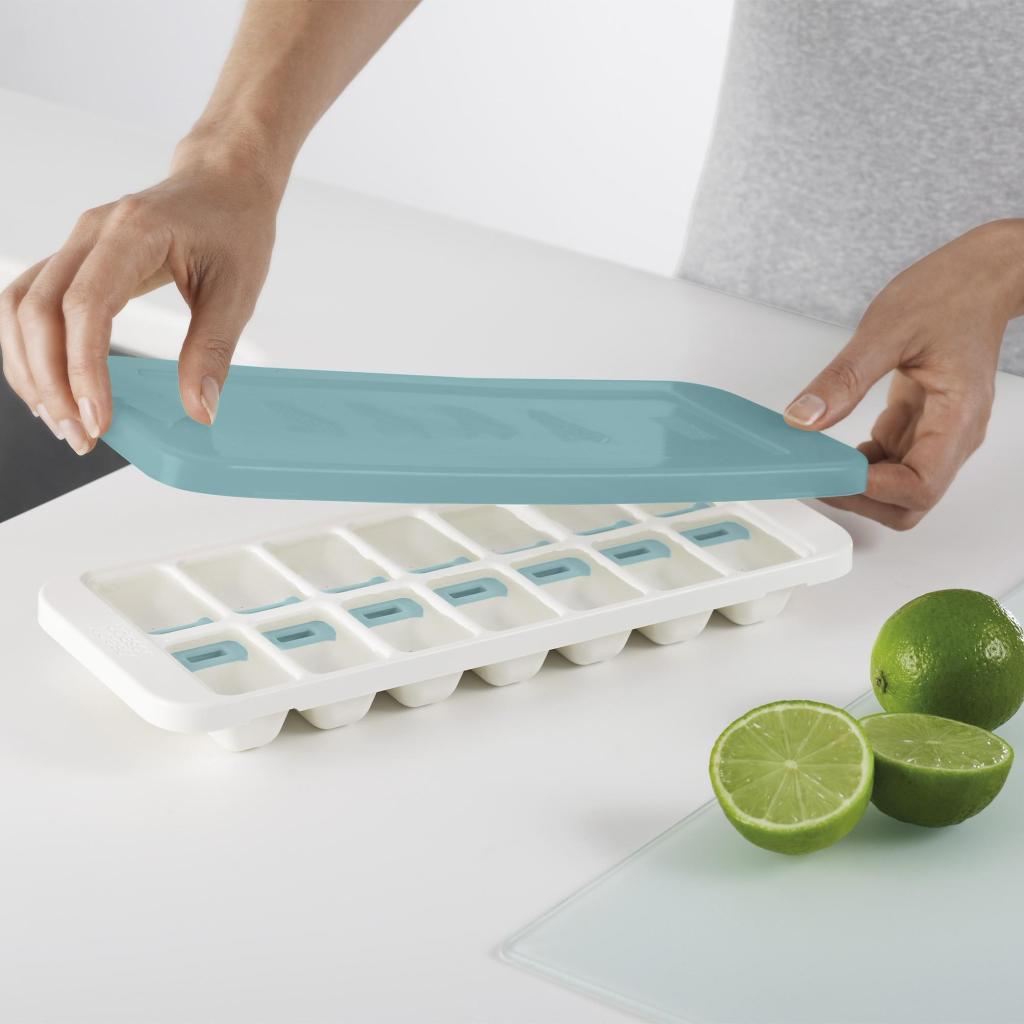 - De IJsblokjesvorm Joseph Joseph DUO maakt gebruik van een gepatenteerd mechanisme voor het eenvoudig en gecontroleerd loslaten van individuele blokjes zonder dat ze allemaal tegelijk hoeven te worden uitgegoten.