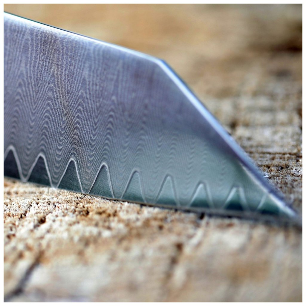 De messen van deze messen worden gehard in hoogprecieze vacuümwarmtebehandelingsovens. Elk mes wordt met de hand geslepen en bereikt met een hardheid van ongeveer 61 HRC een buitengewone tot extreme scherpte. De Japanse damascusstalen messenset met een indrukwekkend patroon dat lijkt op de bloesems van de beroemde Japanse kersenboom is het ideale geschenk voor iedereen die vaak in de keuken staat en voor wie snijden meer is dan een noodzakelijk kwaad.