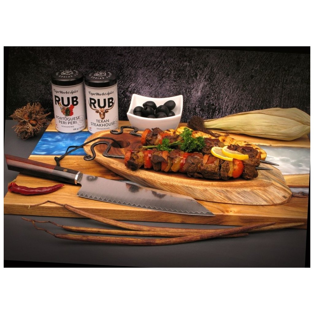 Het achthoekige handvat is gemaakt van gestabiliseerd rozenhout en ebbenhout. Het is versierd met een centrale mozaïekklinknagel en altijd zorgvuldig met de hand gepolijst, ergonomisch gevormd. Ideaal ontworpen voor uitstekende handbediening. De speciaal ontworpen vorm van de beschermer is geschikt voor de Aziatische mesgreep.