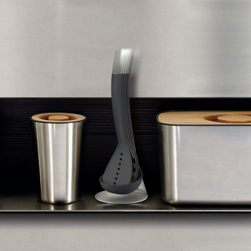 Compacte set JOSEPH JOSEPH Nest 100 keukengerei met magnetische handgrepen. Set bestaat uit geperforeerde draaier, spaghettitool, geperforeerde lepel, lepel en opscheplepel. Het innovatieve model Nest 100 Utensils wordt geleverd met een aparte standaard waarop u gereedschap kunt plaatsen dat op dat moment niet wordt gebruikt. De gereedschappen zijn temperatuurbestendig tot 200 °C en zijn vaatwasmachinebestendig. Nest Utensils werd bekroond met de Red Dot Award Winner 2012.