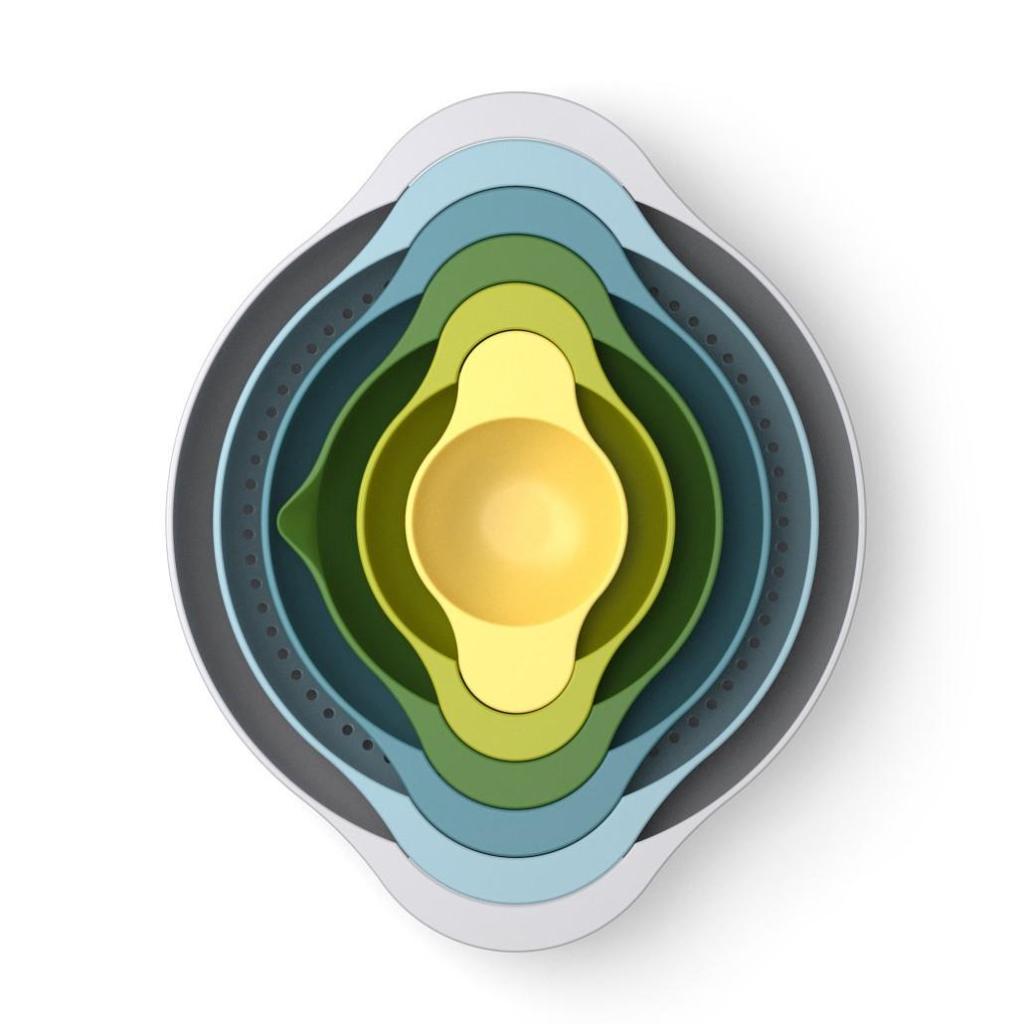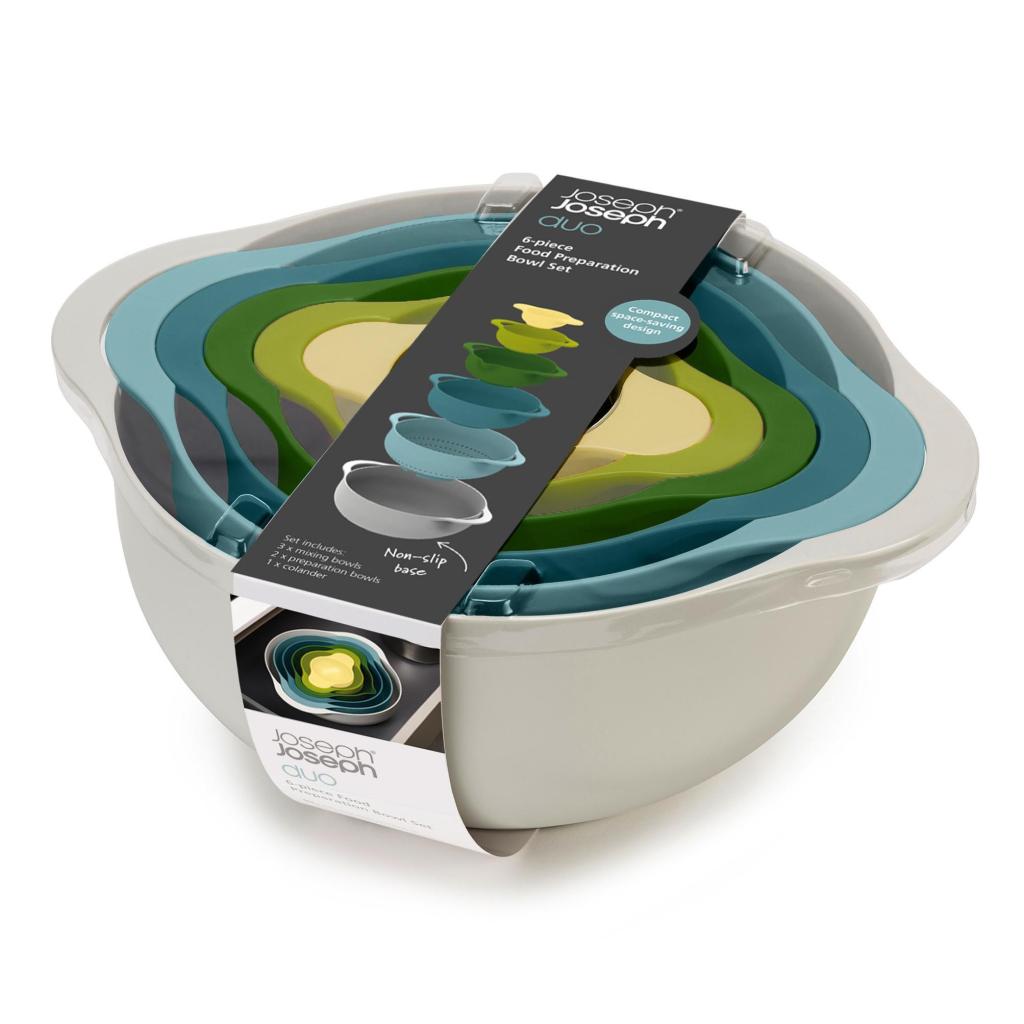 - De zesdelige compacte keukenuitrusting Joseph Joseph DUO OPAL biedt een praktische oplossing voor het bereiden van ingrediënten, het mengen van deeg en het afgieten van voedsel in één ruimtebesparend geheel.