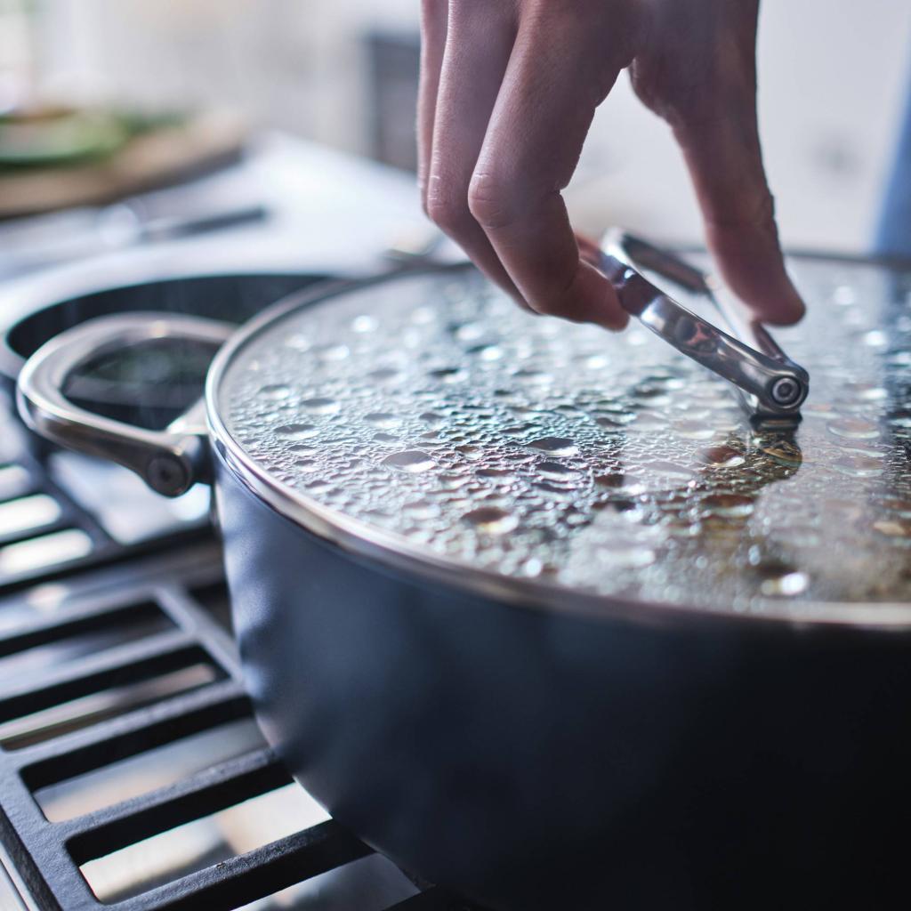 - De pan is geschikt voor alle soorten fornuizen en kookplaten, inclusief inductie, en past zich daardoor gemakkelijk aan elk type keuken aan.