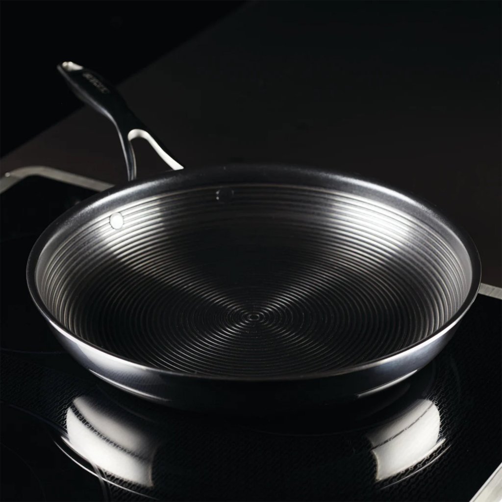- het hybride antiaanbakoppervlak met verhoogde roestvrijstalen elementen beschermt de antiaanbakgroeven, zodat je je geen zorgen hoeft te maken over krassen of afbladderen van de coating bij gebruik van metalen keukengerei
