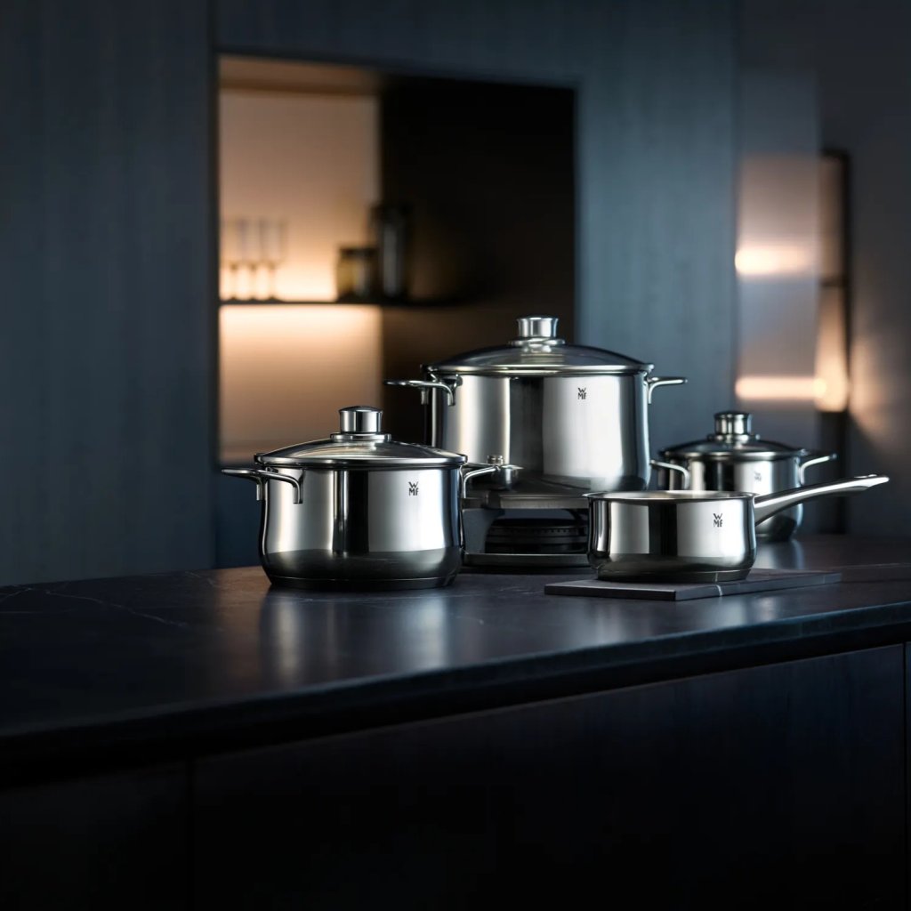Stel je een team chef-koks voor dat hier komt wonen. Iedereen heeft zijn plaats, iedereen weet wat hij doet en iedereen werkt samen zonder onnodig commentaar. Deze set WMF DIADEM PLUS ziet er ongeveer zo uit. Potten, pannen, messen en scharen - allemaal in perfecte harmonie, klaar om je chaos om te toveren in een keuken vol vertrouwen.