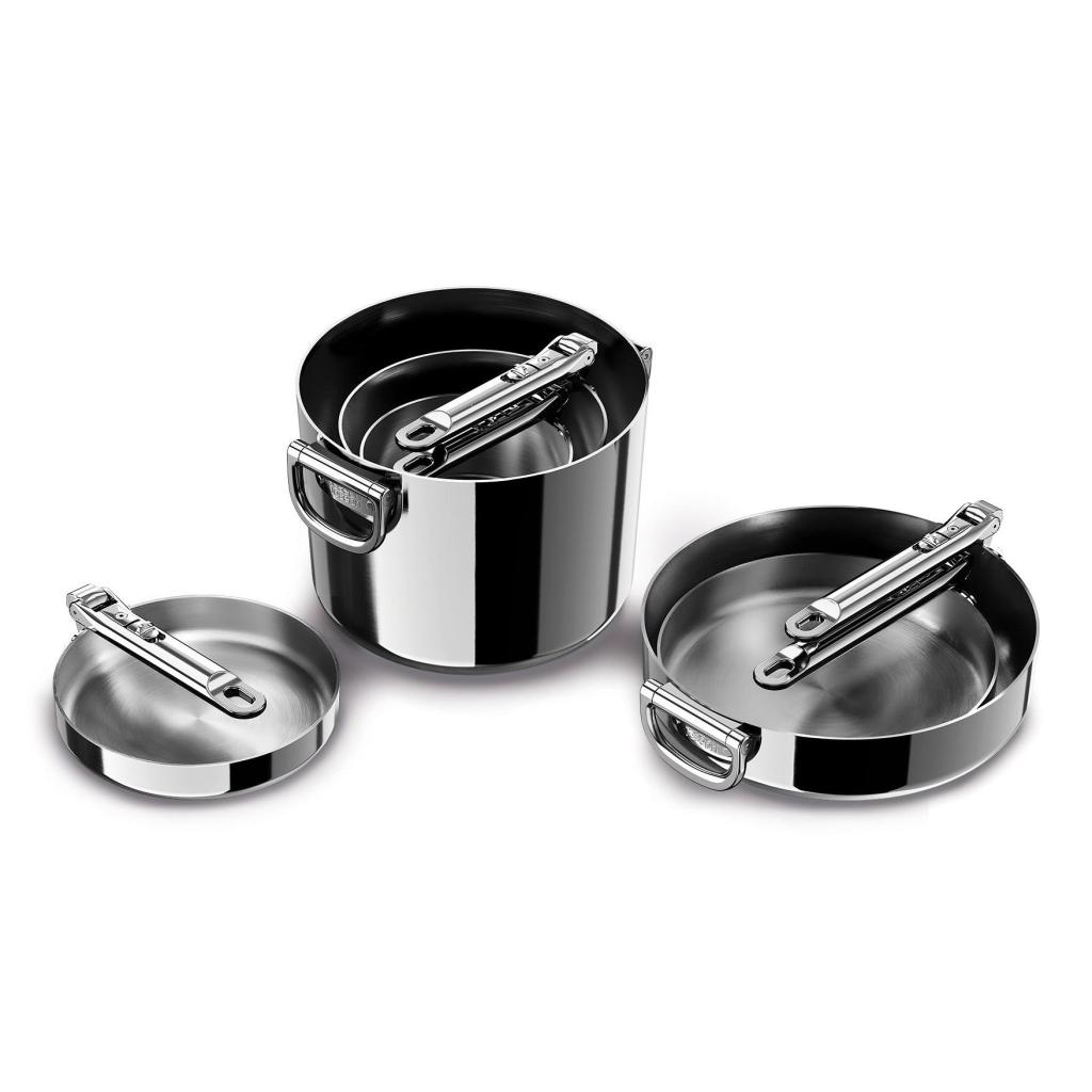 - Het compacte stapelbare ontwerp maakt het mogelijk om de individuele potten en pannen in elkaar te schuiven, terwijl de inklapbare handgrepen de benodigde opbergruimte tot 50% verminderen.