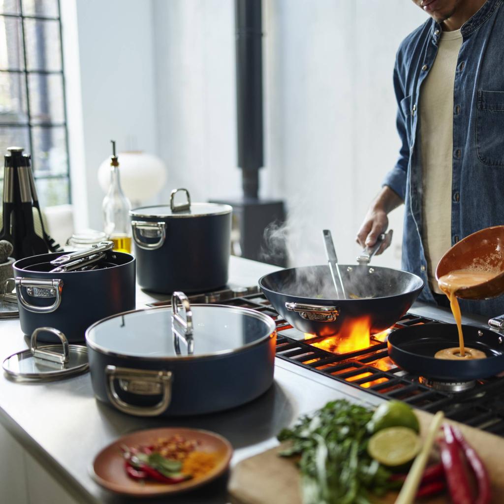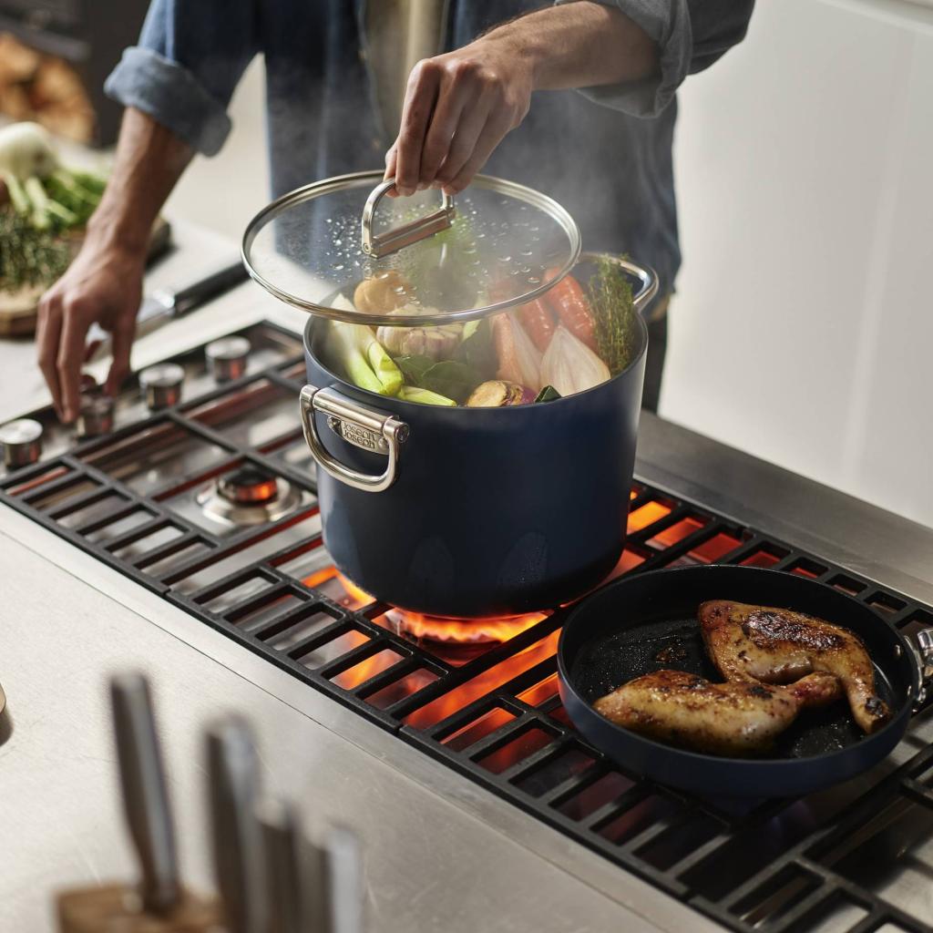 - Door de handgrepen in te klappen, wordt aanzienlijk ruimte bespaard, wat vooral handig is in kleinere keukens of bij het stapelen van meerdere kookgerei op elkaar.