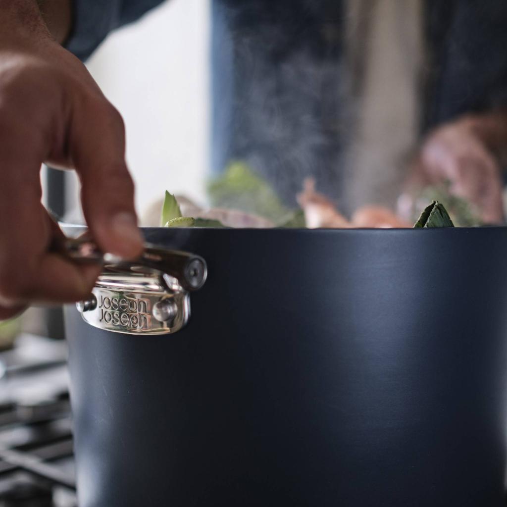 Kookgerei dat de realiteit van de moderne keuken begrijpt - Joseph Joseph SPACE. Tijdens het koken staat hij stevig en zeker, klaar om alles aan te kunnen, van een snel ontbijt tot een geïmproviseerd diner. Maar als het tijd is om op te ruimen, verandert hij van karakter en past hij zich onopvallend aan de ruimte aan, zonder meer ruimte in te nemen dan strikt noodzakelijk. Wat wil je nog meer?