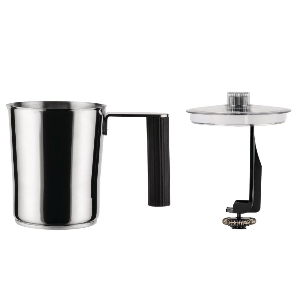 De melkopschuimer bestaat uit een motoreenheid met een verwarmingsbasis van thermoplastisch hars en een roestvrijstalen kan met een handvat en een deksel met een knop, een binnenhouder voor het opschuimen van vloeistoffen en een metalen spiraalvormige opschuimer. De verwarmingsbasis is voorzien van een stekker, START/STOP-schakelaar en programmakeuzeknop. De roestvrijstalen kan heeft markeringen aan de binnenkant die maximale en minimale vulniveaus aangeven voor de vier verschillende programma's: warme melk, warme opschuimende melk, koude opschuimende melk en warme chocolade.