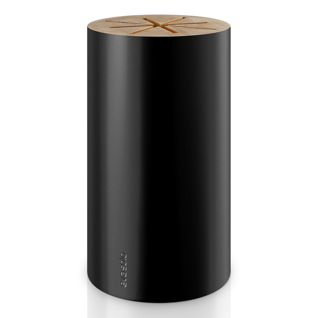 Het ronde messenblok Nordic kitchen van het Deense bedrijf Eva Solo is de perfecte combinatie van massief hout en elegant design. Het binnenste gedeelte van de standaard van onbewerkt beukenhout contrasteert met de zwart gelakte buitenkant. De standaard kan tot acht messen bevatten met een maximale lemmetlengte van 25 cm - afhankelijk van de lemmetvorm.