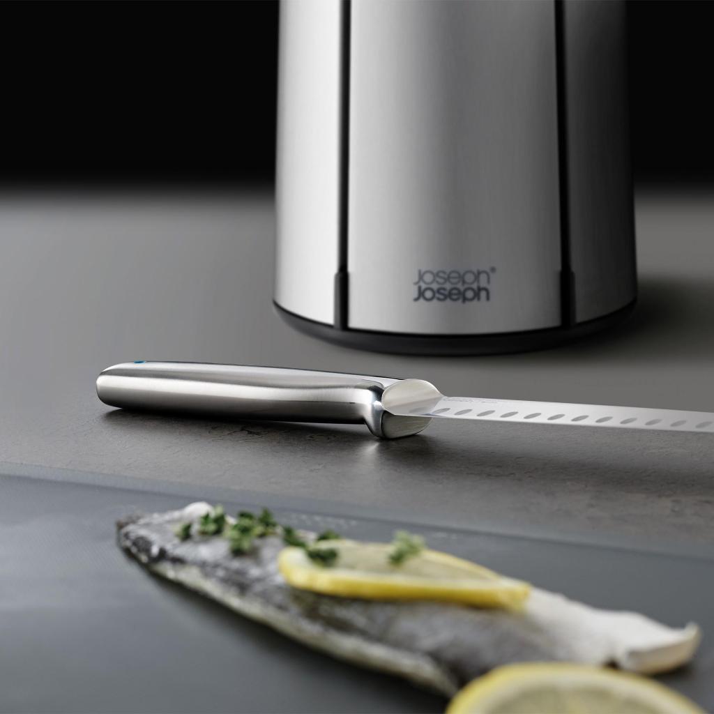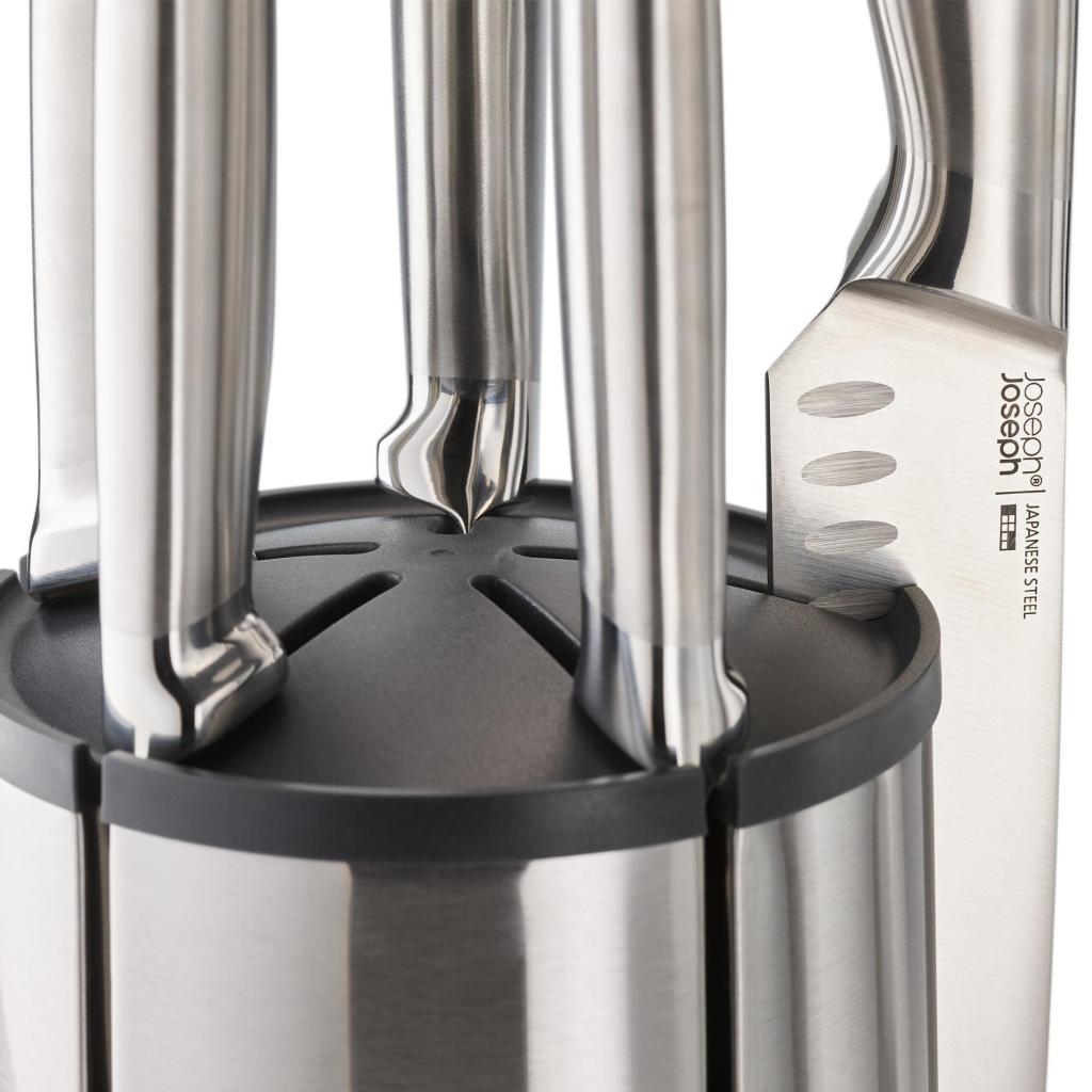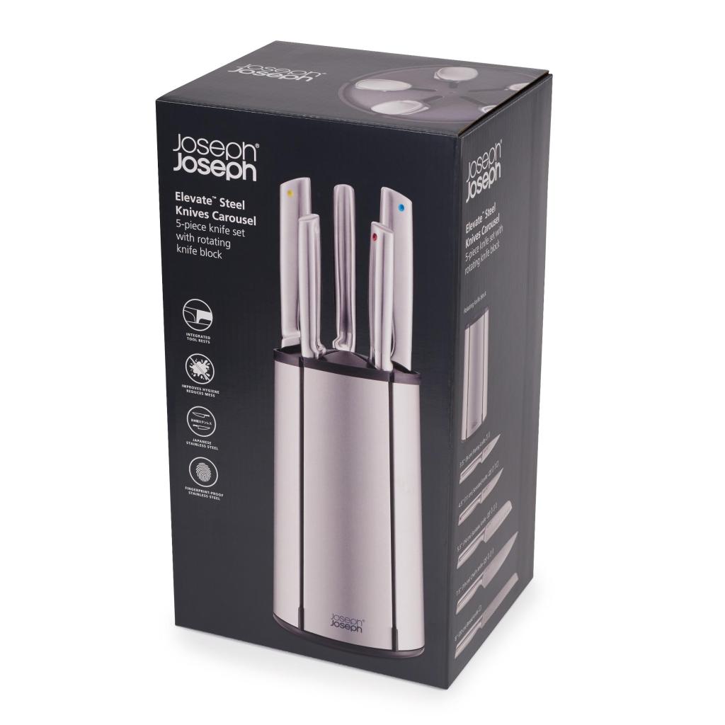 - De Joseph Joseph ELEVATE STEEL messenset met draaibare standaard biedt een complete oplossing voor de dagelijkse bereiding van ingrediënten, waarbij u alle belangrijke messen overzichtelijk opgeborgen en direct beschikbaar heeft tijdens het koken.