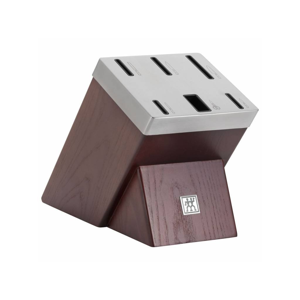 Het design messenblok van duurzaam essenhout en elegant roestvrij staal is dankzij het merk Zwilling verheven tot de meesterslijper in uw huis. Dankzij de KIS-technologie (Keep It Sharp) blijven uw messen altijd scherp. Moeiteloos en zonder training, waardoor u tijd bespaart. Het gebruikte mechanisme is even briljant als eenvoudig. In de sleuven voor het opbergen van messen zijn keramische messenslijpers geïntegreerd, die dankzij de juiste hoek het mes slijpen telkens wanneer het mes uit het blok wordt gehaald. Het blok is ook voorzien van eenvoudige pictogrammen, zodat zelfs niet-ingewijden kunnen begrijpen hoe zij de messen correct moeten hanteren. Het blok is geschikt voor messen met rechte messen, messen met gekartelde messen worden niet geslepen in dit blok.