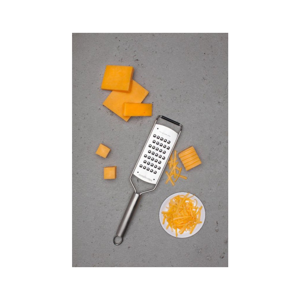 Een grove rasp produceert dikkere, grotere stukken dan een middelgrove rasp. Het is optimaal om de textuur van individuele ingrediënten te benadrukken, die zowel visueel als qua smaak opvallen in geserveerde gerechten. Hij kan alle soorten kaas aan, van zachte mozzarella tot de meest gerijpte schapenkaas of pittige cheddar. Alle soorten groenten en fruit zijn zo klaar. De stabiele, anti-slip eindkap verbetert het gebruik van de rasp tot het absolute maximum.