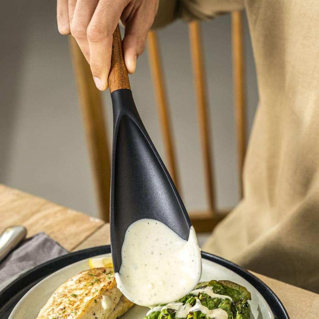 - gebruik hem om ingrediënten te verplaatsen, te draaien, te mengen, op te tillen en te serveren