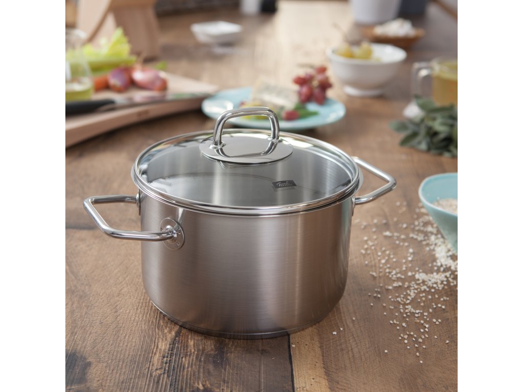 Het ontwerp van het Fissler viseo® kookgerei is zeer tijdloos en past in elke keuken. Strakke lijnen, hoogwaardige afwerking en praktische kenmerken zijn de belangrijkste redenen waarom deze serie zo populair is bij klanten. Het minimalistische uiterlijk van het kookgerei biedt de perfecte gelegenheid om te schitteren, vooral met het voedsel dat u erin bereidt!