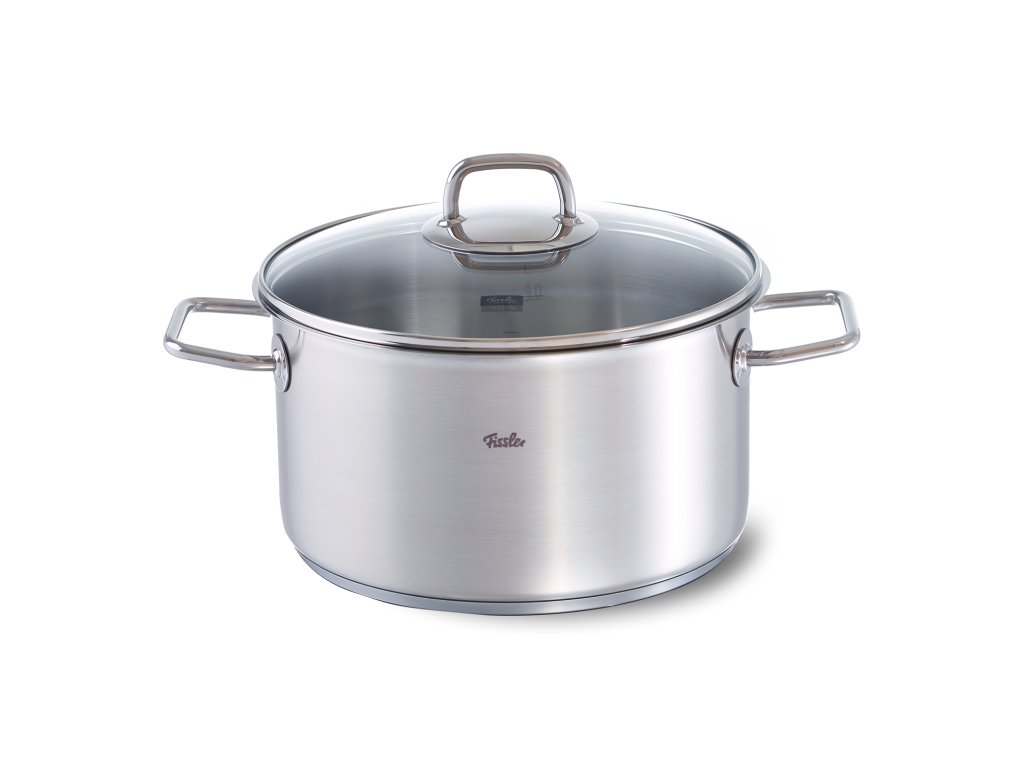 Het glazen deksel met groot handvat sluit nauw aan op de rand van de pan, waardoor de kooktijd korter is en de ingrediënten meer smaak, kleur en vitaminen behouden. Het gebruikte glas is gehard en kan dus ook bij het bakken in de oven worden gebruikt. De gebogen, bredere rand van de pot zorgt ervoor dat u niet per ongeluk morst.