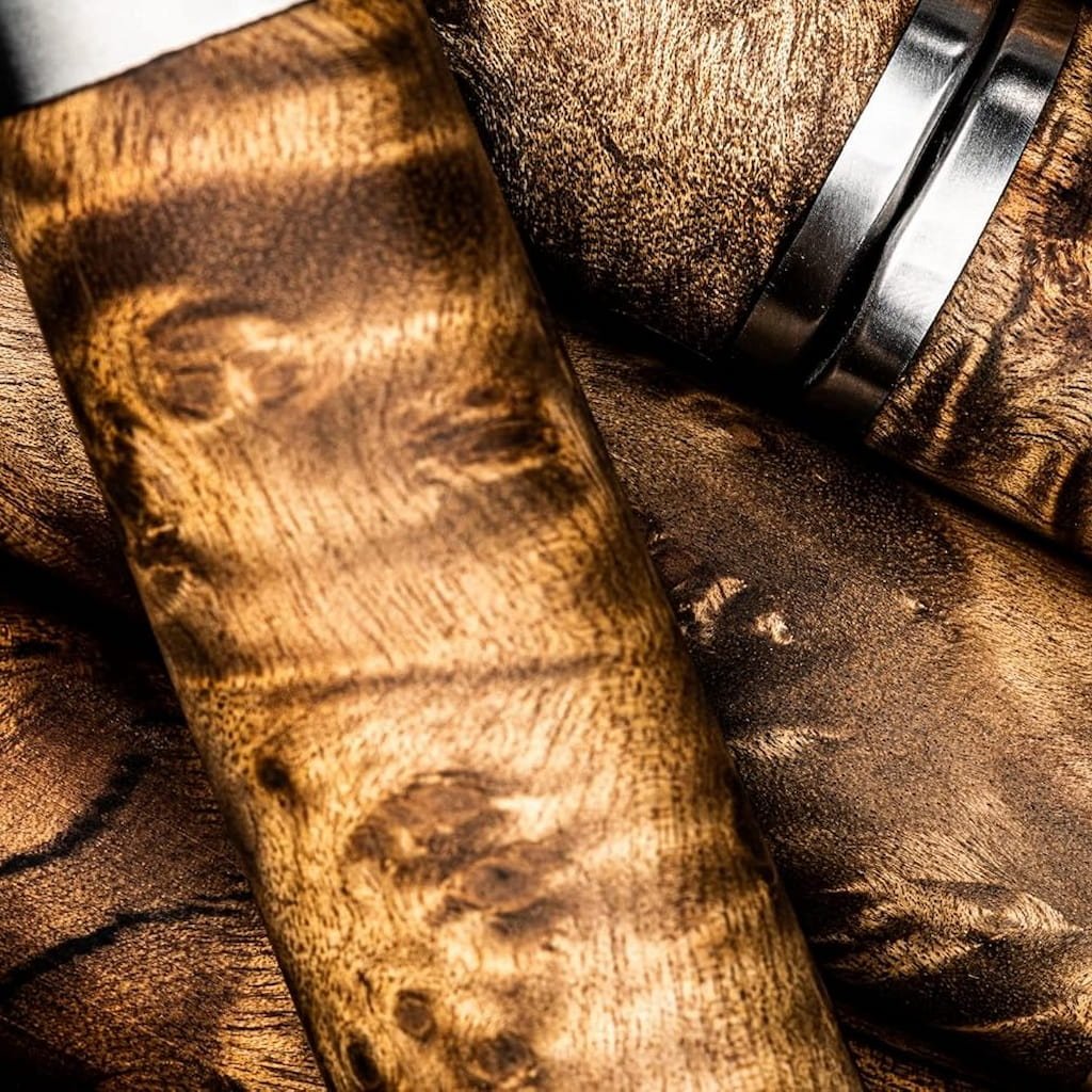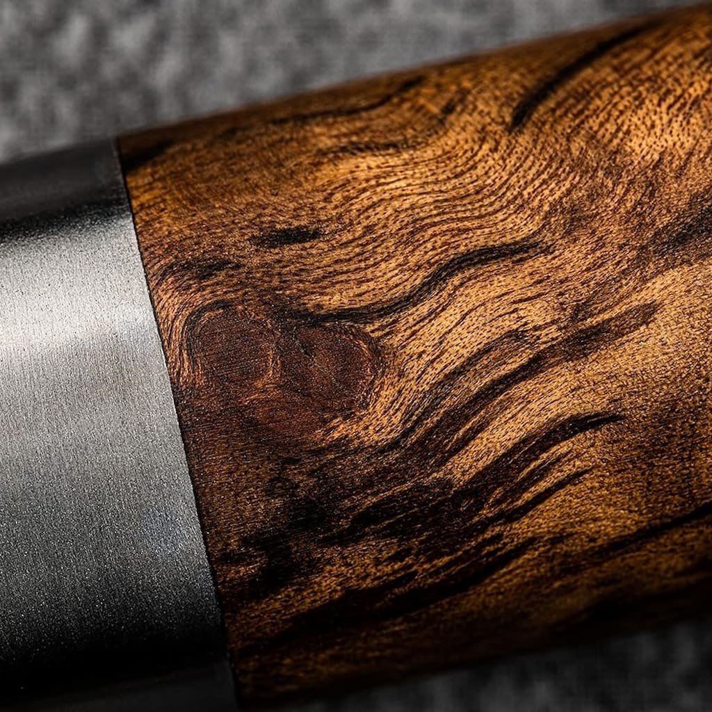 - het lemmet met zijn matte afwerking en zichtbare metalen structuur ziet er robuust uit en vormt een sterk visueel contrast met de glanzende afwerking van het handvat
