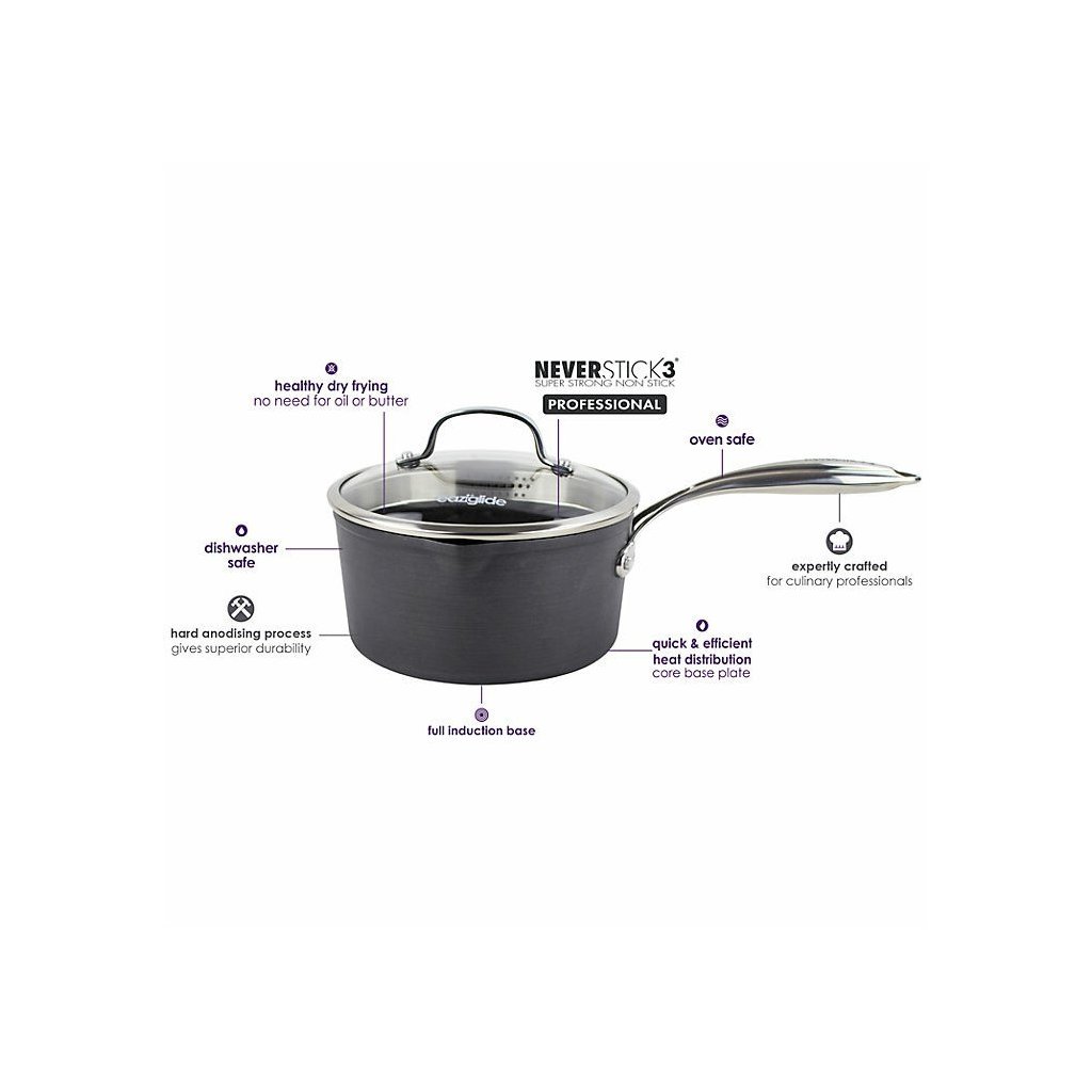 De Eaziglide Neverstick3 Professional kookgerei collectie omvat het beste assortiment. Het is gemaakt van geanodiseerd vliegtuig aluminium voor intense duurzaamheid. De nieuwste en verbeterde anti-aanbaklaag gaat veel langer mee dan andere oppervlakken. Het is ideaal voor culinaire professionals. Dit kookgerei van topkwaliteit is ideaal voor alle soorten fornuizen, inclusief inductie, en kan ook worden gebruikt om te bakken in de oven tot 260 °C en is vaatwasmachinebestendig. Koken wordt gezonder met dit kookgerei omdat u kunt koken zonder olie of andere vetten.
