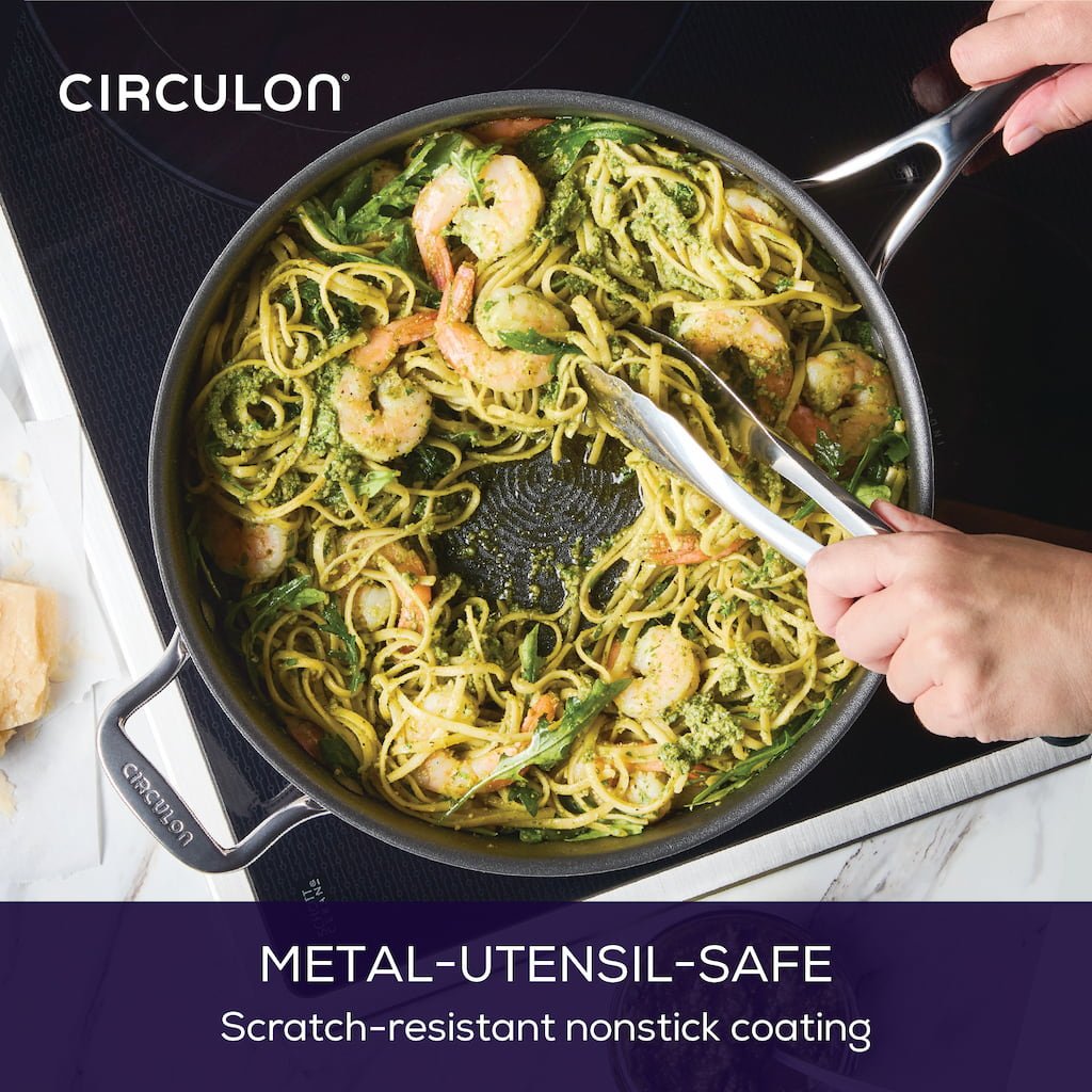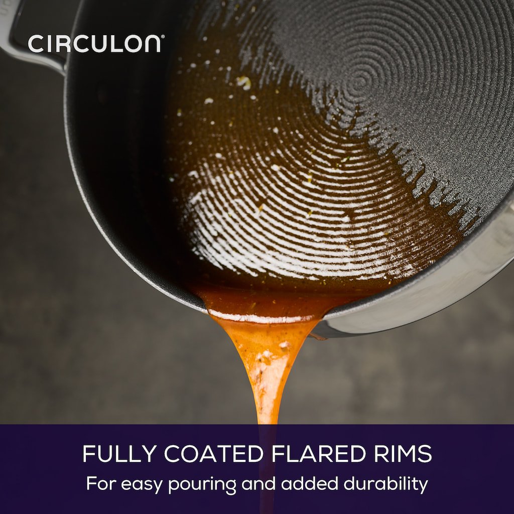 - grote sauteerpan met deksel Circulon SCRATCHDEFENSE C1 met een inhoud van 4,7 liter is dankzij de brede vorm en hoge rand een ideale keuze voor een combinatie van sauteren, stoven en bakken