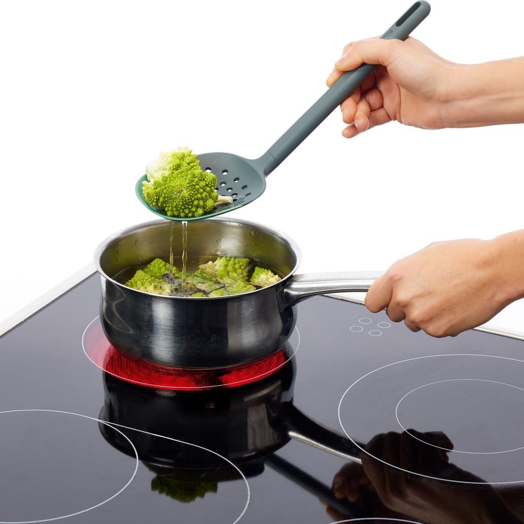 - Dankzij de brede kop kun je zelfs grotere hoeveelheden groenten, knoedels of vlees rechtstreeks uit de pan scheppen.