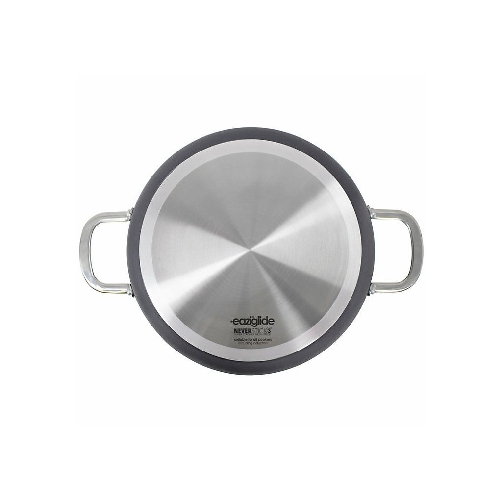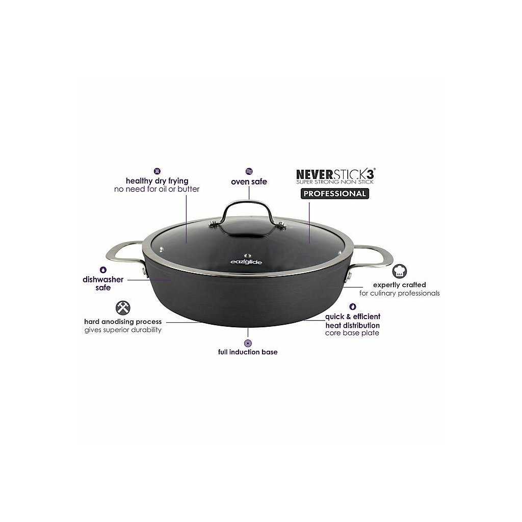 De Eaziglide Neverstick3 Professional kookgerei collectie omvat het beste assortiment. Het is gemaakt van geanodiseerd vliegtuig aluminium voor intense duurzaamheid. De nieuwste en verbeterde anti-aanbaklaag gaat veel langer mee dan andere oppervlakken. Het is ideaal voor culinaire professionals. Dit kookgerei van topkwaliteit is ideaal voor alle soorten fornuizen, inclusief inductie, en kan ook worden gebruikt om te bakken in de oven tot 260 °C en is vaatwasmachinebestendig. Koken wordt gezonder met dit kookgerei omdat u kunt koken zonder olie of andere vetten.