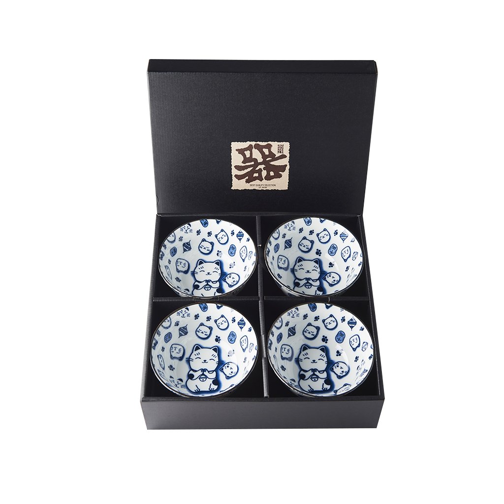Set bestaat uit 4 schaaltjes met blauwe Japanse katten op witte achtergrond. De rand van de schalen is omrand met zilver. Deze set wordt geleverd in een elegante zwarte geschenkdoos en is daarom geschikt als cadeau voor vrienden of zakenpartners.