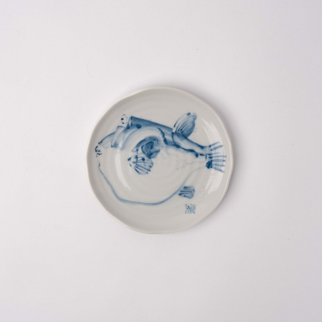 Dit bord is precies goed voor momenten waarop je je gasten wilt laten glimlachen voordat ze ook maar iets geproefd hebben. De blauw-witte fugu ziet er vriendelijk, een beetje verbaasd en erg "instagram" uit. Wat je er ook op zet, het krijgt altijd een air van vertederende absurditeit.