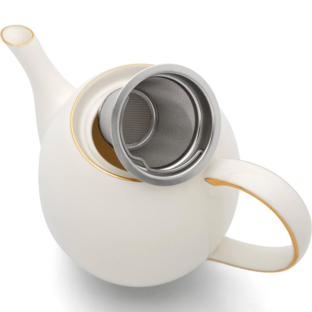 - de theepot heeft een uitneembaar roestvrijstalen zeefje voor losse thee of kruiden