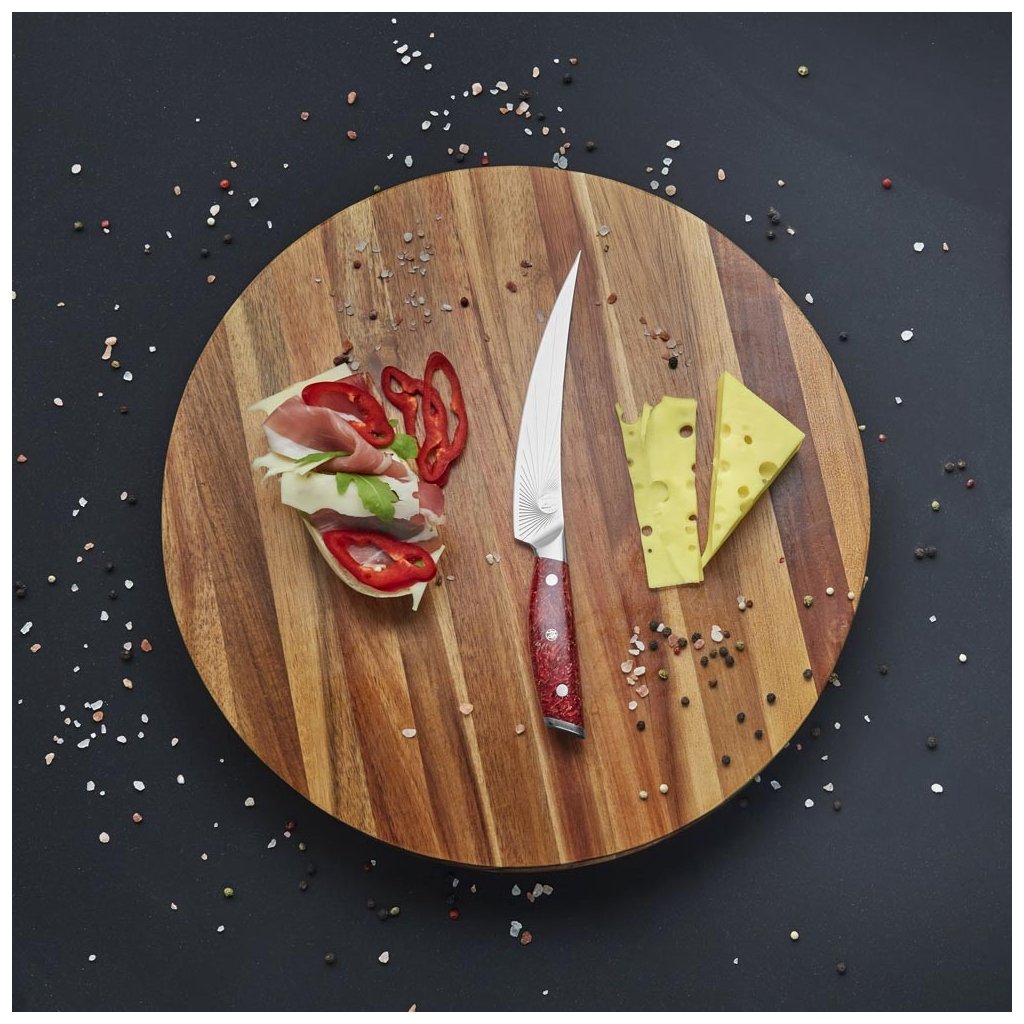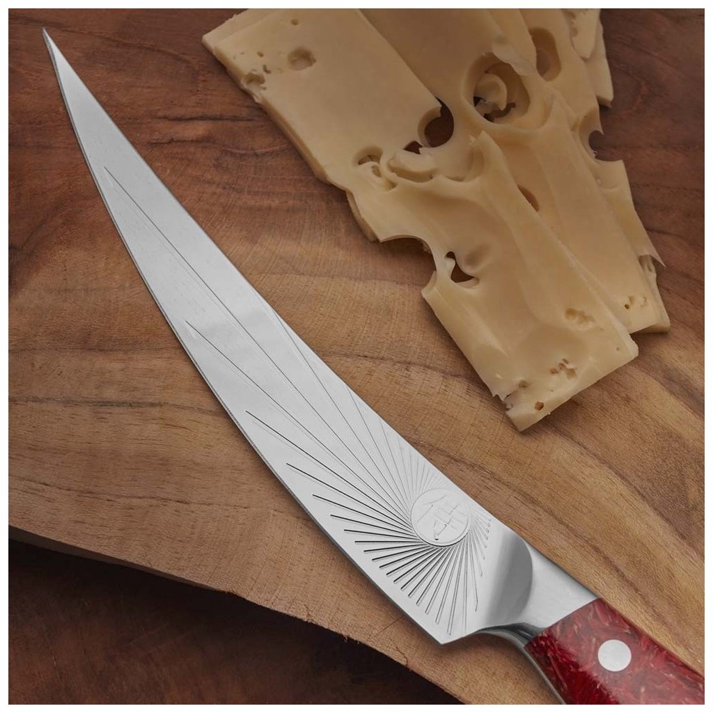 - zonnestraalpatroon op het blad minimaliseert wrijving bij het snijden en voorkomt dat voedsel aan het blad blijft kleven