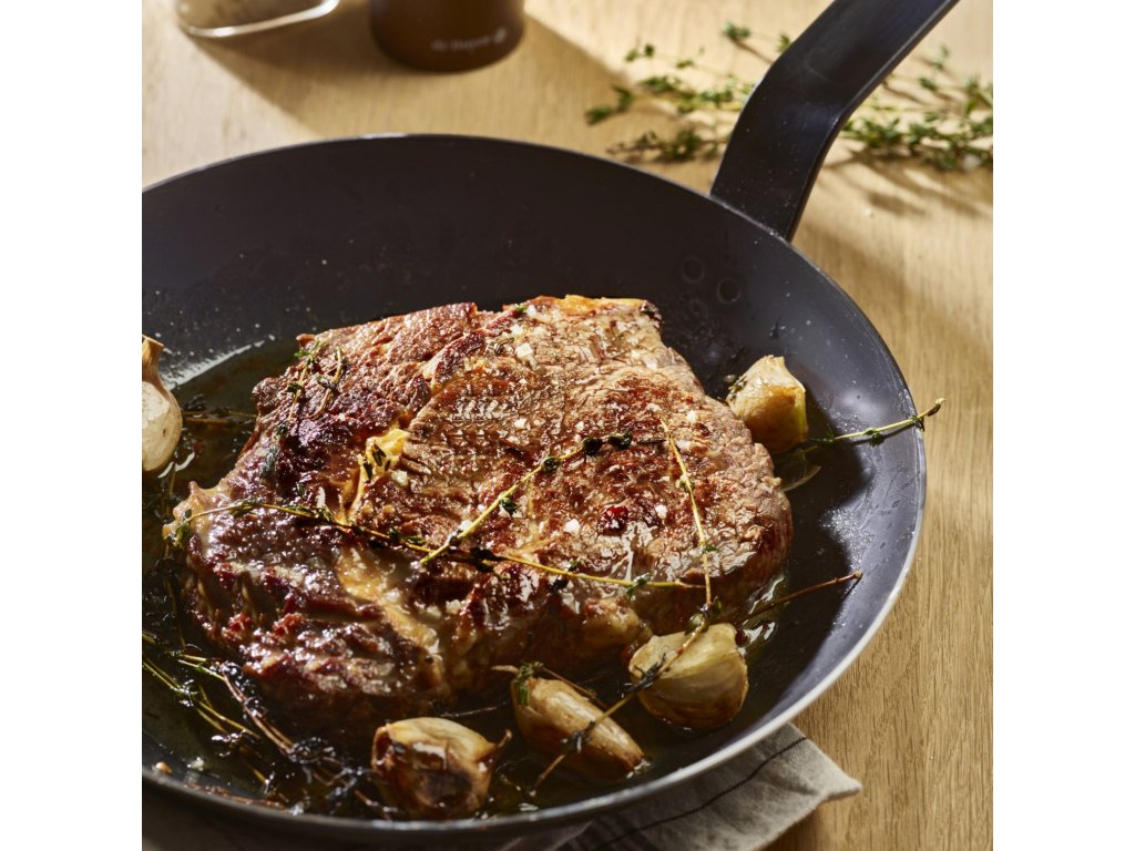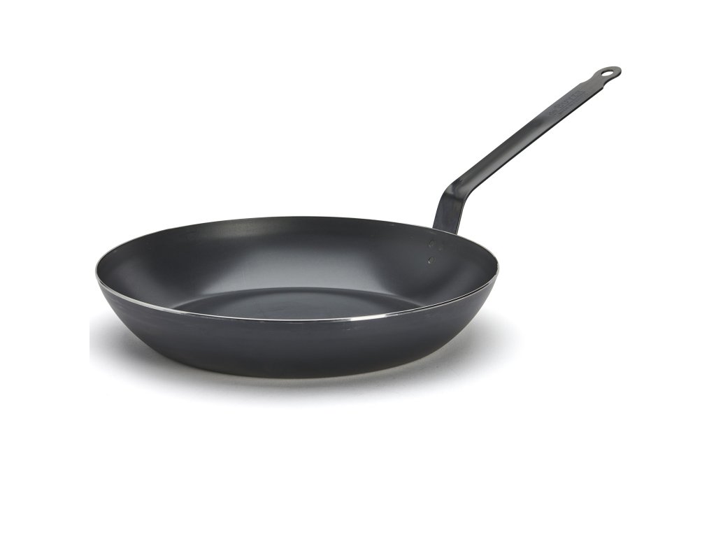 - de veelzijdige pan van blauw koolstofstaal is ideaal om te bakken, sauteren en braden