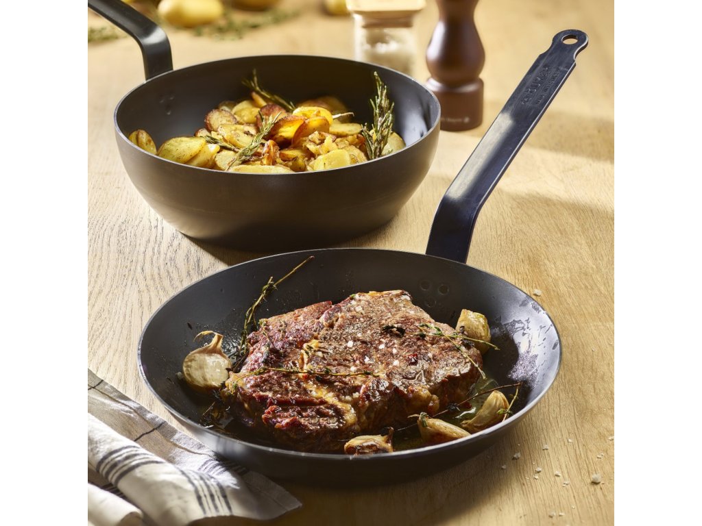 - de veelzijdige pan van blauw koolstofstaal is ideaal om te bakken, sauteren en braden