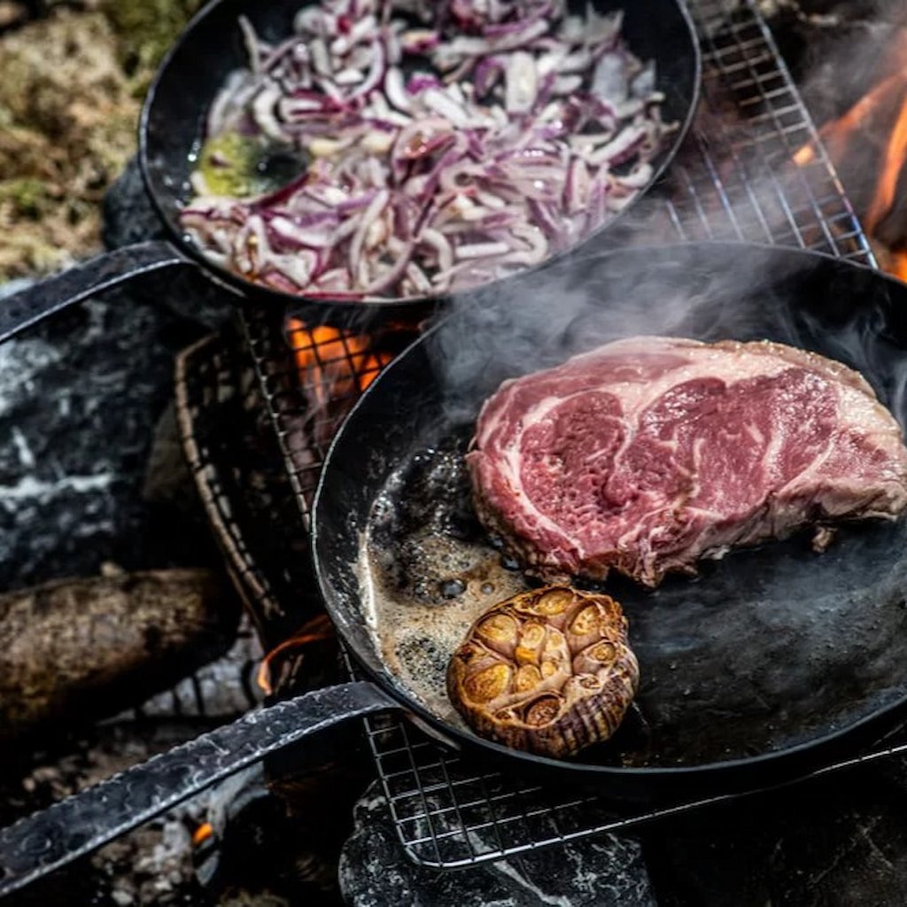 - De stevige geklonken verbindingen en het stevige handvat liggen stevig in de hand en worden zelfs gewaardeerd bij het hanteren van zwaarder voedsel of op een open vuur.
