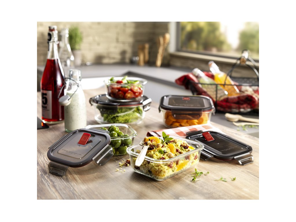 De Gusto multifunctionele kom is gemaakt van hittebestendig glas en kan daarom worden gebruikt voor het bakken in zowel conventionele als magnetronovens. Dankzij het lekvrije, perfect afsluitende deksel is het ook een praktisch hulpmiddel voor het bewaren of vervoeren van levensmiddelen. Het deksel is ook voorzien van een eenvoudig sluitmechanisme, zodat u er zeker van kunt zijn dat er geen druppel uit de container lekt.