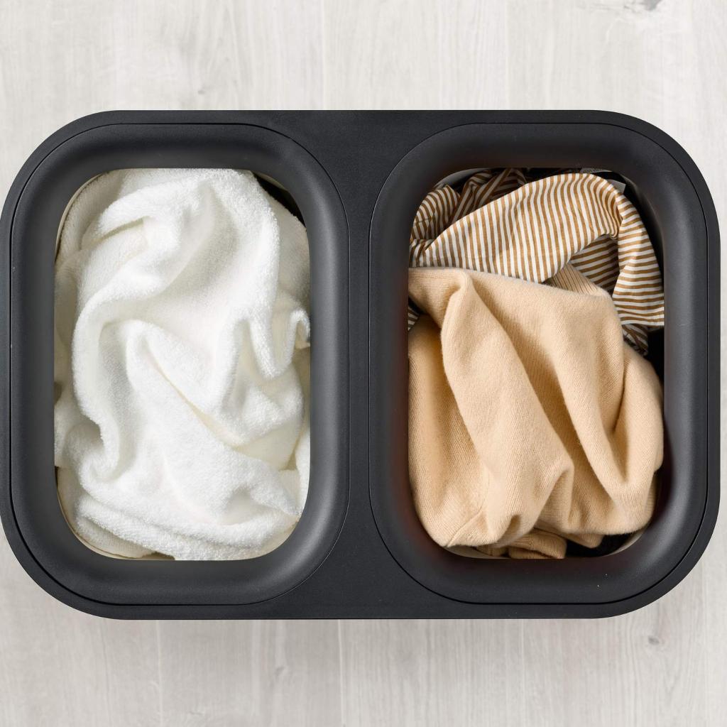 - Twee aparte compartimenten van 45 liter maken het gemakkelijk om licht, donker of delicaat wasgoed al bij het opbergen te scheiden.