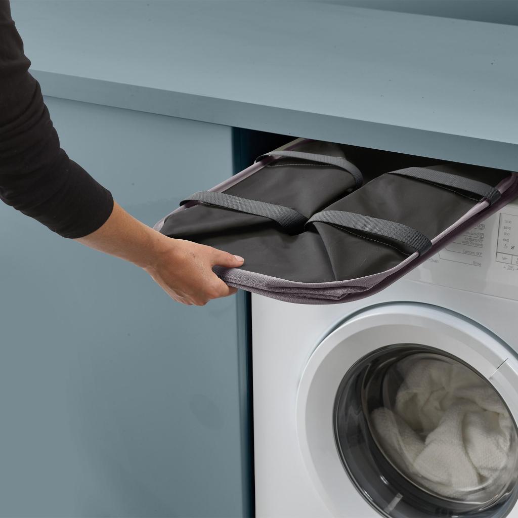 - Het vochtbestendige binnenoppervlak beschermt het materiaal tegen absorberen en maakt snel en eenvoudig afvegen mogelijk na contact met vochtig wasgoed.