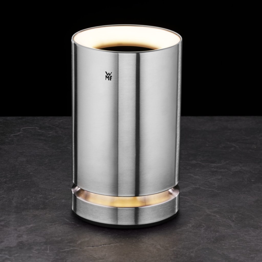 De Ambiente champagne- en wijnkoeler van WMF is gemaakt van geborsteld Cromargan® roestvrij staal. Dankzij de koelbatterij kunt u tot 4-5 uur lang perfect gekoeld genieten van champagne of witte wijn. Dat is de levensduur van de batterij. Naast koeling zorgt dit apparaat voor een perfecte sfeer. Inbegrepen is LED verlichting in 3 intensiteiten. De verlichting wordt bediend door eenvoudigweg de wand van het vat aan te raken.