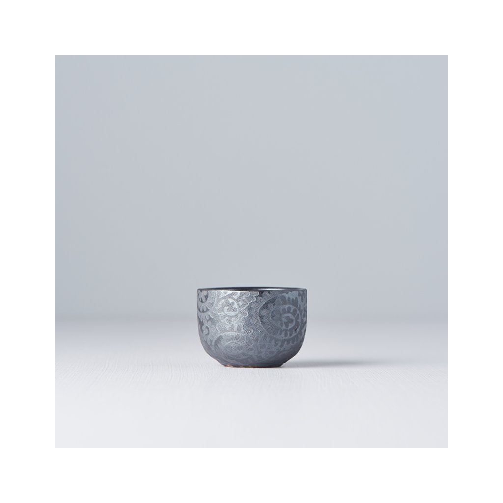 De sakebowl is grijs van kleur en geeft de indruk dat hij van metaal is. Het heeft subtiele grijze en matte versieringen aan de buitenkant.